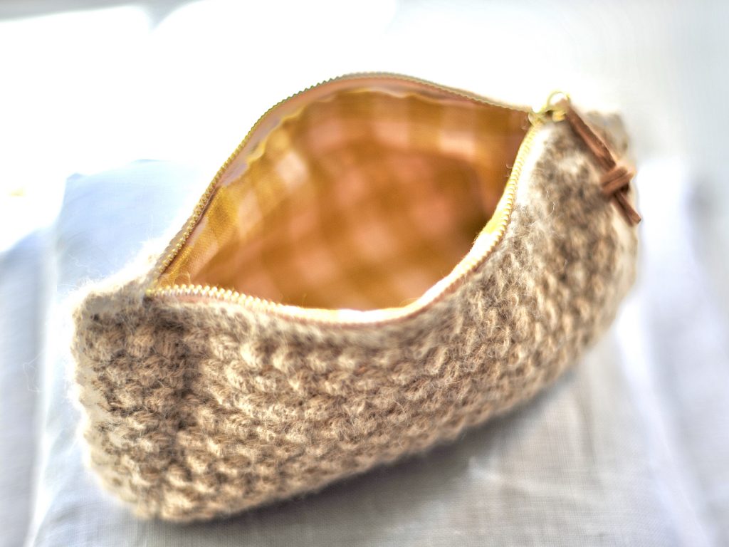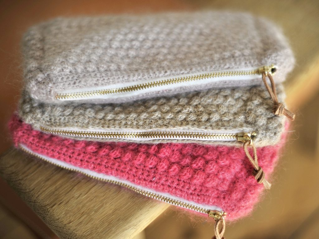 Sie sind von Hand gehäkelt und werden mit wunderschönen Stoffen von Merchant & Miles von innen verziert. Die Reisverschlüsse sind aus Messing. Sie sind für alles geeignet was man besonders lieb hat. Es gibt sie in verschiedenen Ausführungen. Die Größe ist ca DIN Lang – je nach verarbeiteter Wolle etwas größer oder kleiner. Hier findest Du ein paar Beispiele und Preise.